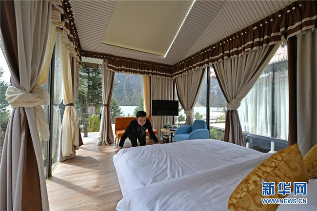 5月24日,一名營(yíng)地工作人員在客房?jī)?nèi)整理房間。