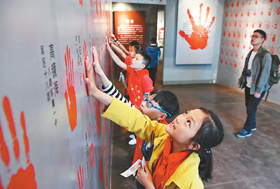 圖為孩子們?cè)诮ùú┪镳^參與互動(dòng)游戲。