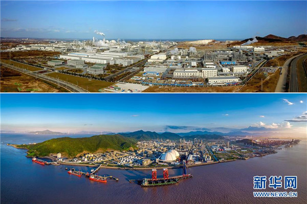 上圖:萬華煙臺工業(yè)園航拍畫面(2018年12月4日無人機(jī)拍攝,新華社記者郭緒雷攝);下圖:萬華寧波公司全景圖(資料照片)。新華社發(fā)