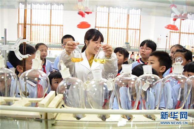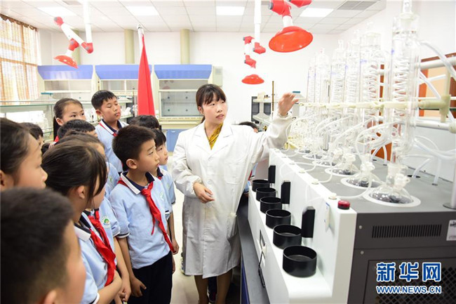 6月4日,自來水廠工作人員向小學(xué)生介紹檢測自來水的儀器。
