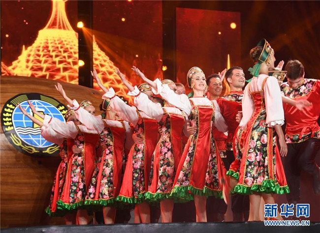 來自俄羅斯的演員在青島國際啤酒節(jié)開幕式上表演(2018年7月20日攝)。新華社記者 李紫恒 攝