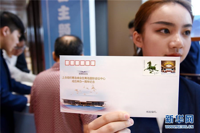 6月9日,工作人員展示上合青島峰會一周年紀(jì)念封。新華社記者 李紫恒 攝