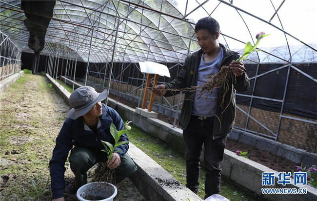 6月12日,在四川黃龍管理局花卉培育基地,林業(yè)高級工程師周聽鴻(左)準(zhǔn)備移栽人工保育的杓蘭。新華社記者江宏景攝