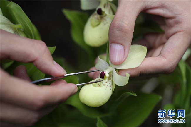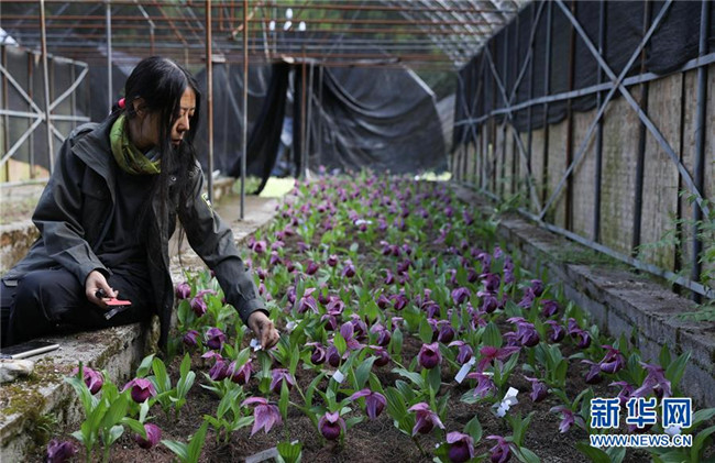 6月12日,在四川黃龍管理局花卉培育基地,四川黃龍自然保護(hù)區(qū)的高級顧問干文清在給人工保育的杓蘭標(biāo)注標(biāo)識(shí)。 新華社記者江宏景攝
