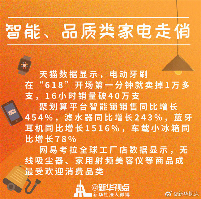 除了滿足“剛需”的大家電,提升生活品質(zhì)的小家電也十分走俏。天貓數(shù)據(jù)顯示,電動(dòng)牙刷在“618”開場第一分鐘就賣掉1萬多支,16小時(shí)銷量破40萬支。聚劃算平臺(tái)智能鎖銷售額同比增長454%,濾水器同比增長243%,藍(lán)牙耳機(jī)同比增長1516%,車載小冰箱同比增長78%。在網(wǎng)易考拉全球工廠店,無線吸塵器、家用射頻美容儀等商品成最受歡迎消費(fèi)品類。
