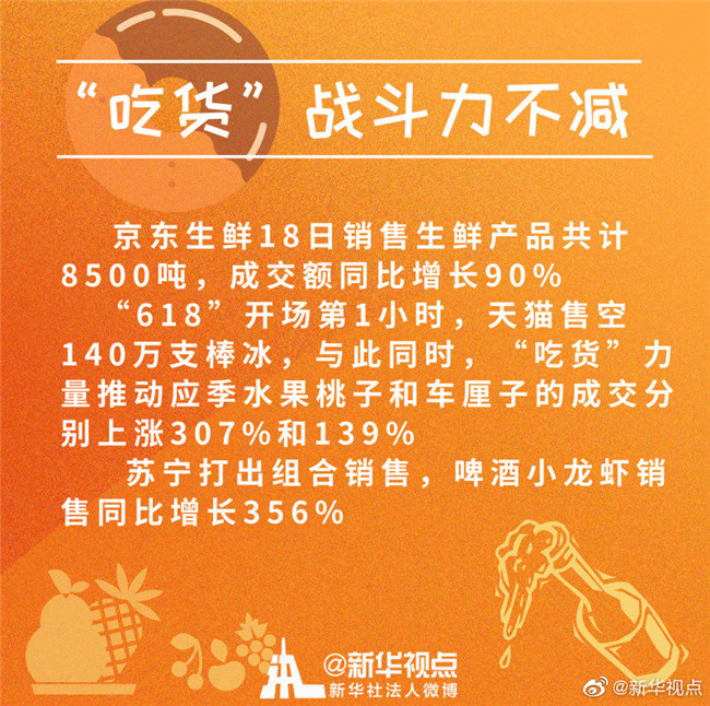 京東生鮮18日銷售生鮮產(chǎn)品共計(jì)8500噸,成交額同比增長90%。6月16日第1小時(shí),天貓售空140萬支棒冰,“吃貨”力量推動(dòng)應(yīng)季水果桃子和車?yán)遄映山活~分別上漲307%和139%。蘇寧打出組合銷售,啤酒小龍蝦銷售同比增長356%……