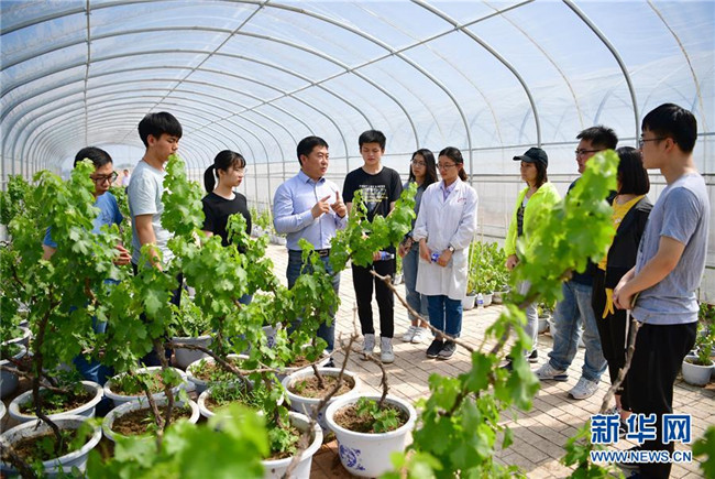 西北農(nóng)林科技大學(xué)葡萄酒學(xué)院院長(zhǎng)房玉林(左四)在為該院學(xué)生講解葡萄種植(5月24日攝)。新華社記者邵瑞攝