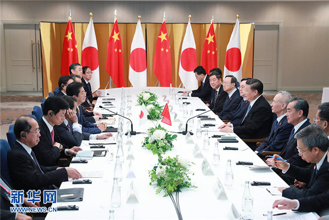 習(xí)近平強(qiáng)調(diào),雙方要始終恪守中日四個政治文件確立的各項原則,踐行中日“互為合作伙伴、互不構(gòu)成威脅”的政治共識,增進(jìn)互信,推動中日關(guān)系始終沿著和平、友好、合作的正確軌道持續(xù)向前發(fā)展。要深化經(jīng)貿(mào)、投資、第三方市場、科技創(chuàng)新等廣泛領(lǐng)域合作,打造新的合作增長點,積極引領(lǐng)區(qū)域經(jīng)濟(jì)一體化。我們歡迎日本企業(yè)積極擴(kuò)大對華合作,分享中國發(fā)展新機(jī)遇。共建“一帶一路”倡議為中日互利合作開辟了廣闊天地,歡迎日方積極參與。雙方要拉緊人文紐帶,加強(qiáng)兩國青少年交流,促進(jìn)兩國民眾相知相親。我贊同年內(nèi)啟動中日高級別人文交流磋商機(jī)制。要通過對話協(xié)商建設(shè)性管控矛盾分歧,加強(qiáng)外交和安全領(lǐng)域?qū)υ?,?gòu)建建設(shè)性雙邊安全關(guān)系。希望日方恪守迄今共識和承諾,妥善處理好歷史等敏感問題,共同維護(hù)東海和平穩(wěn)定。中日應(yīng)該加強(qiáng)在國際和地區(qū)事務(wù)中的溝通、協(xié)調(diào)、合作,共同應(yīng)對全球性挑戰(zhàn),推動全球治理更加公正合理。中方支持日方辦好二十國集團(tuán)領(lǐng)導(dǎo)人大阪峰會,期待峰會發(fā)出維護(hù)多邊主義和自由貿(mào)易的明確聲音,為世界經(jīng)濟(jì)發(fā)展注入穩(wěn)定預(yù)期和動力。