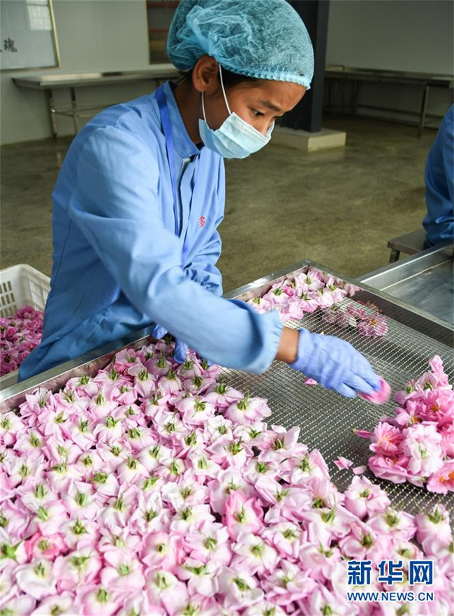 6月26日,在四川省小金縣清多香玫瑰種植專業(yè)合作社,工人準備將玫瑰烘干。新華社記者 高健鈞 攝