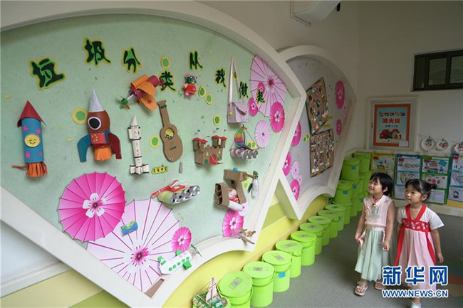 7月4日,德清縣乾元鎮(zhèn)第一幼兒園老師向孩子們講解垃圾分類(lèi)知識(shí)。新華社記者 林善傳 攝