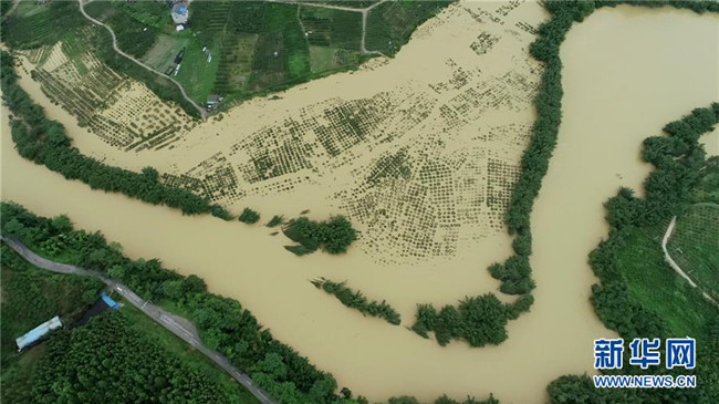 7月9日,廣西柳州市融安縣大將鎮(zhèn)部分地區(qū)被洪水淹沒(無人機(jī)拍攝)。新華社發(fā)(譚凱興 攝)