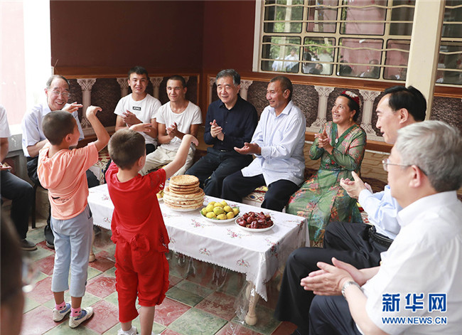 7月14日至16日,第七次全國對口支援新疆工作會議在新疆和田召開。中共中央政治局常委、中央新疆工作協(xié)調(diào)小組組長汪洋出席會議并講話。在和田期間,汪洋還參觀了對口援疆工作成就展,考察了有關(guān)單位和企業(yè),看望了脫貧戶。這是7月15日,汪洋在新疆和田英阿瓦提鄉(xiāng)吐如孜村考察。 新華社記者 丁林 攝