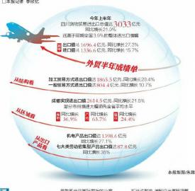 個體的表現(xiàn)匯聚成上半年四川外貿成績單:貨物貿易進出口總值達3033億元,同比增長21.9%,遠高于同期全國3.9%的整體進出口增幅。