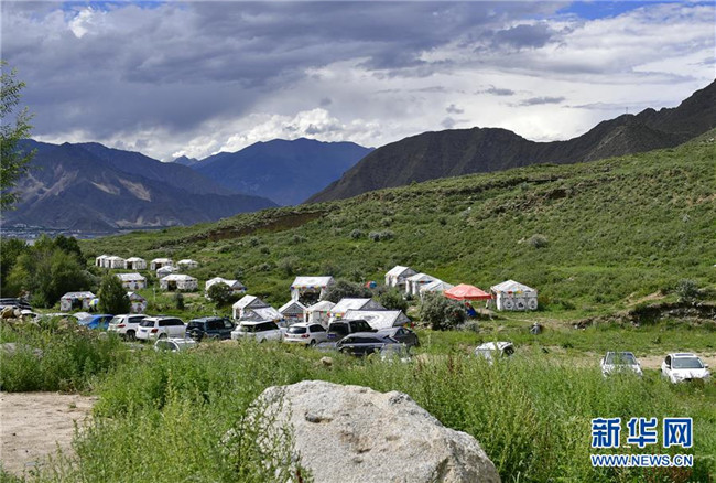 這是達東村景區(qū)的帳篷和旅游車輛(7月20日攝)。西藏拉薩市柳梧鄉(xiāng)達東村是一個千年古村,也曾是一個貧困村。近年來,依托秀美的自然風(fēng)光、深厚的歷史文化和淳樸的風(fēng)土人情,當?shù)卣畬嵤┪幕糜萎a(chǎn)業(yè)精準扶貧,使達東村蛻變成為鄉(xiāng)村旅游勝地。新華社記者張汝鋒攝