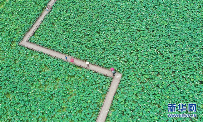 在江西省南昌市新建區(qū)聯(lián)圩鎮(zhèn),游客在當(dāng)?shù)氐那М€荷花園觀賞游玩(7月20日無人機(jī)拍攝)。新華社記者 彭昭之 攝