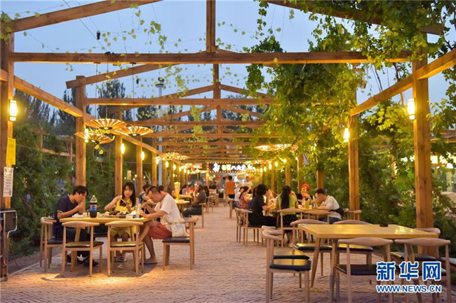 在吐魯番市長(zhǎng)沙·葡萄主題公園夜市,市民和游客在葡萄架下用餐(7月18日攝)。