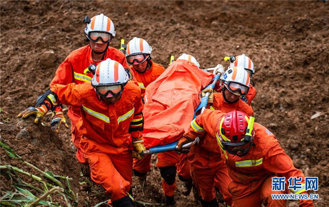 7月24日,救援人員從山體滑坡現(xiàn)場運(yùn)出遇難者遺體。新華社記者 陶亮 攝