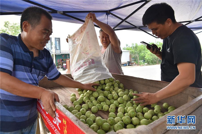 8月5日,在贊皇縣的核桃銷售點,核桃種植戶將核桃賣給經(jīng)銷商。
