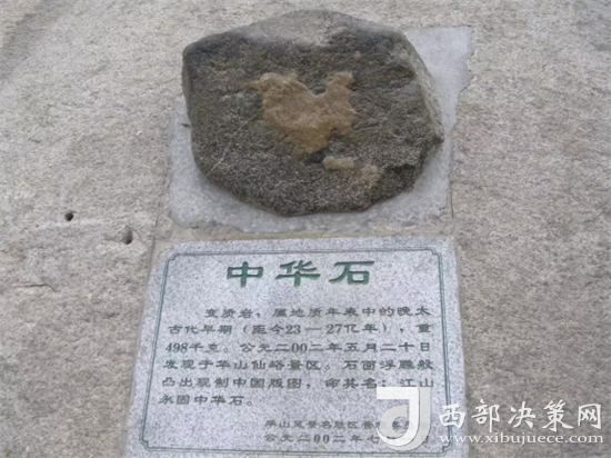 “中華石”于2002年5月20日在華山仙峪景區(qū)被發(fā)現(xiàn)。在淡墨色花崗巖石面上,浮雕般凸現(xiàn)出一塊白色石圖,此圖酷似現(xiàn)制中國版圖,十分形象通真。該石重約498千克,云母花崗巖石,大約形成于三千萬年前的白堊時(shí)期,現(xiàn)置北峰。(供稿:華旅集團(tuán)營銷中心)