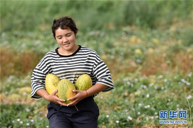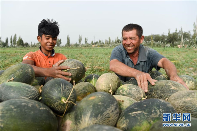 8月11日,在新疆伽師縣,瓜農在采摘伽師瓜。新華社記者 丁磊 攝