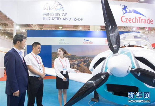 6月8日,在浙江寧波舉行的首屆中國(guó)-中東歐國(guó)家博覽會(huì)上,一名展商(右)在介紹捷克生產(chǎn)的一款輕型飛機(jī)。新華社記者 翁忻旸 攝