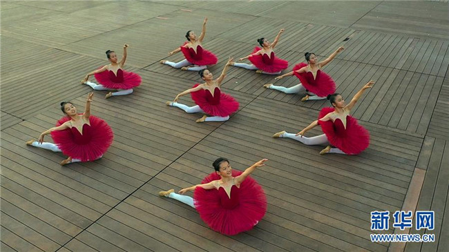 8月7日黃昏時,芭蕾小天使們在欽州市白石湖公園排練(視頻截圖)。新華社記者 張愛林 攝