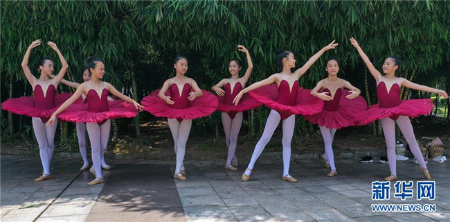 8月7日,在欽州市白石湖公園,芭蕾小天使們在練習(xí)芭蕾舞。新華社記者 張愛林 攝