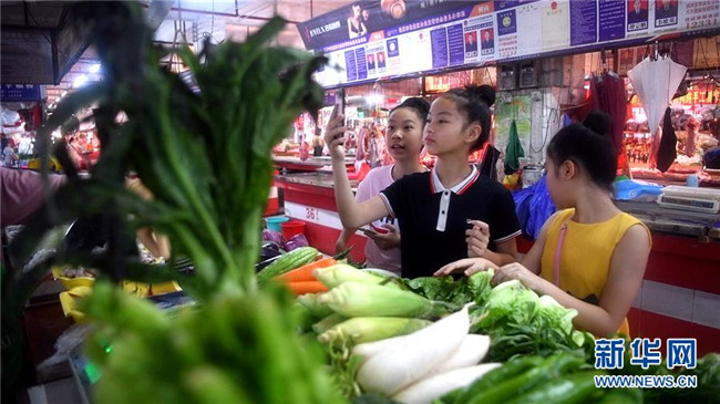 8月6日,芭蕾小天使們在市場上買菜,幫助父母分擔家務(wù)活(視頻截圖)。新華社記者 張愛林 攝