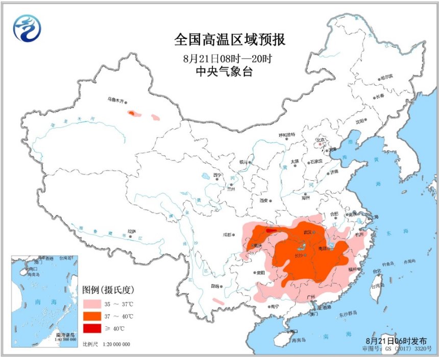 未來(lái)三天,西南地區(qū)東部、江漢、江南、華南中北部等地將有高溫天氣。中央氣象臺(tái)8月21日06時(shí)繼續(xù)發(fā)布高溫黃色預(yù)警。預(yù)計(jì)8月21日白天,江漢大部、江南大部、四川盆地東部、重慶、貴州東部、華南中北部等地最高氣溫35~36℃,其中,湖北中南部、湖南大部、江西大部、四川東北部、重慶大部、廣西東北部等地的部分地區(qū)最高氣溫37~39℃,重慶北部局地可達(dá)40℃以上。