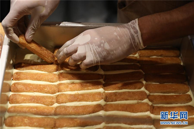 8月23日,在意大利首都羅馬的一家餐廳,一名廚師將制作好的奶酪糊覆蓋在浸泡過咖啡的手指餅干上。