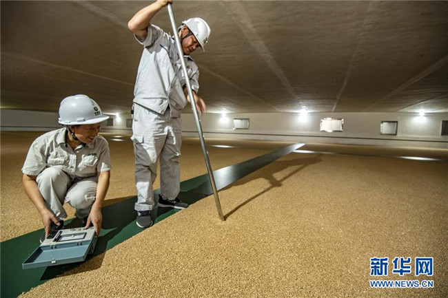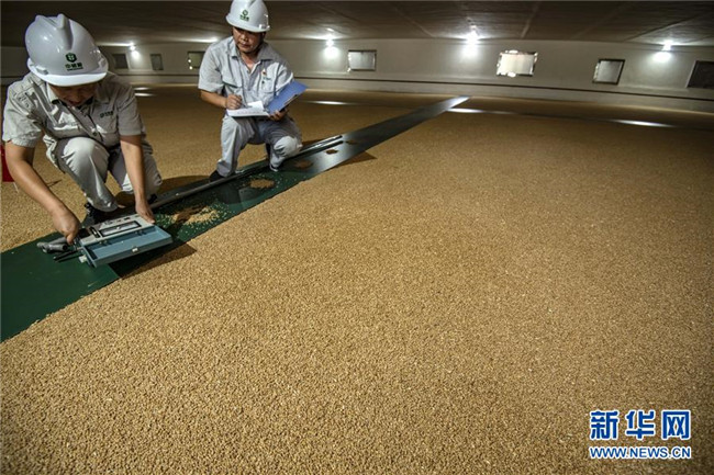 8月25日,中儲(chǔ)糧襄陽(yáng)直屬庫(kù)的職工在糧庫(kù)內(nèi)進(jìn)行糧情檢測(cè)。