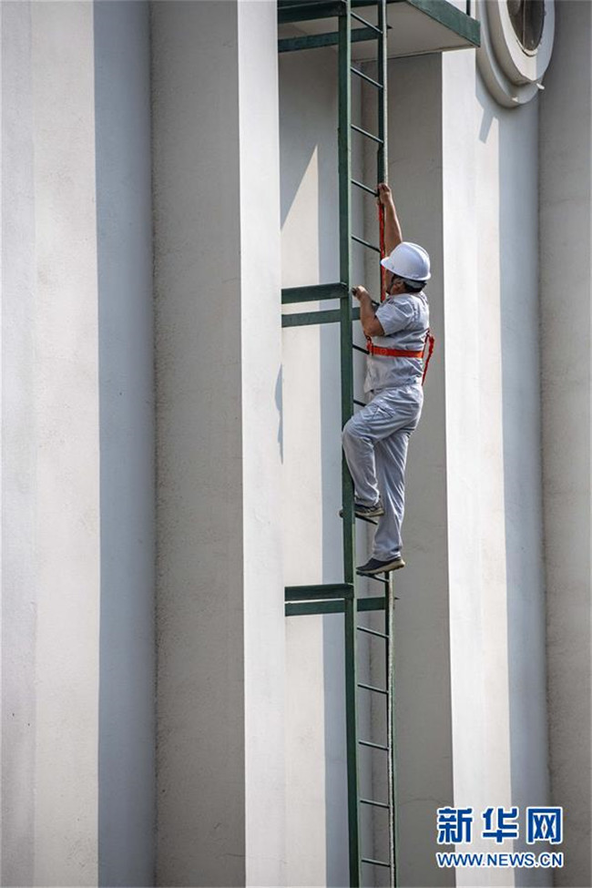 8月26日,中儲(chǔ)糧襄陽(yáng)直屬庫(kù)的一名職工在查看倉(cāng)房外墻情況。