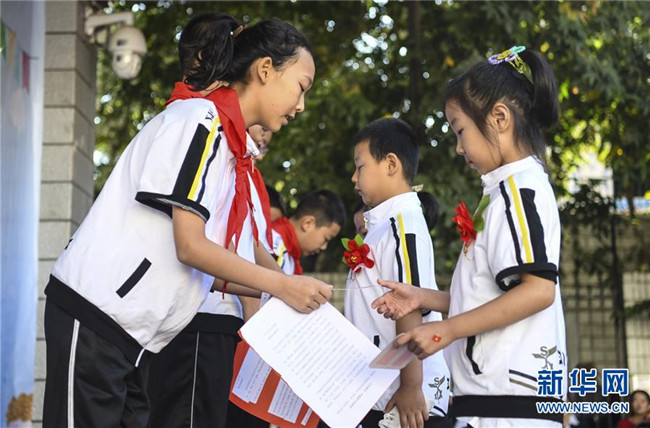9月4日,新疆教育學院實驗小學校園內,一年級新生在六年級學生的指導下學習握拳宣讀誓言。