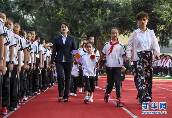 9月4日,新疆教育學院實驗小學校園內,一年級新生在六年級學生和老師的引領下走進校園。