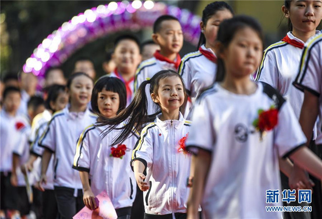 新學年伊始,新疆教育學院實驗小學舉辦主題為“夢想從這里啟航”的開學典禮,一年級新生在六年級學生的引領下培養(yǎng)愛學校、愛師長、愛學習的品德,走進校園開啟新生活。 新華社記者 王菲 攝