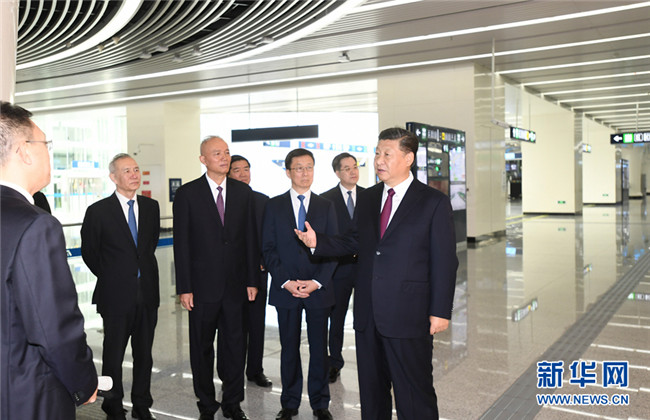 9月25日上午,北京大興國(guó)際機(jī)場(chǎng)投運(yùn)儀式在北京舉行。中共中央總書(shū)記、國(guó)家主席、中央軍委主席習(xí)近平出席儀式,宣布機(jī)場(chǎng)正式投運(yùn)并巡覽航站樓。這是習(xí)近平在軌道交通大興機(jī)場(chǎng)線(xiàn)草橋站進(jìn)站大廳,結(jié)合展板聽(tīng)取情況介紹。 新華社記者 鞠鵬 攝
