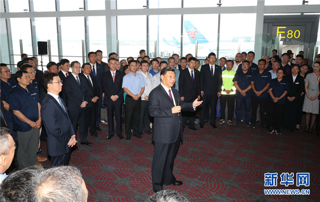 大興機(jī)場(chǎng)航站樓,是目前全球最大規(guī)模的單體航站樓,以其獨(dú)特的造型設(shè)計(jì)、精湛的施工工藝、便捷的交通組織、先進(jìn)的技術(shù)應(yīng)用,創(chuàng)造了許多世界之最。航站樓里,流線(xiàn)型的空間結(jié)構(gòu)十分寬敞明亮。習(xí)近平步行巡覽站臺(tái)大廳和值機(jī)大廳,實(shí)地了解值機(jī)、安檢、登機(jī)和殘疾人無(wú)障礙設(shè)施等情況,并結(jié)合沙盤(pán)和模型聽(tīng)取機(jī)場(chǎng)總體規(guī)劃、設(shè)施建設(shè)等介紹。習(xí)近平強(qiáng)調(diào),大興國(guó)際機(jī)場(chǎng)是首都的重大標(biāo)志性工程,是推動(dòng)京津冀協(xié)同發(fā)展的骨干工程。京津冀三地要抓住機(jī)遇加強(qiáng)協(xié)同合作,加快推動(dòng)地區(qū)高質(zhì)量發(fā)展。民航業(yè)是國(guó)家重要的戰(zhàn)略產(chǎn)業(yè)。要建設(shè)更多更先進(jìn)的航空樞紐、更完善的綜合交通運(yùn)輸系統(tǒng),加快建設(shè)交通強(qiáng)國(guó)。
