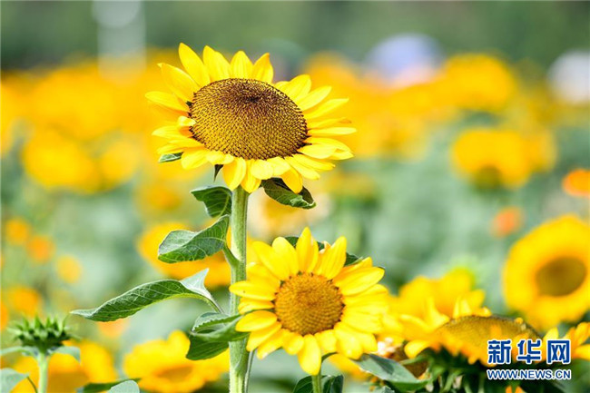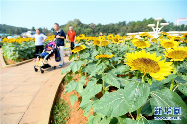 近日,位于長沙市的湖南省森林植物園中的向日葵在秋陽下競(jìng)相綻放,黃花綠葉交相輝映,吸引眾多市民、游客前來觀賞。
