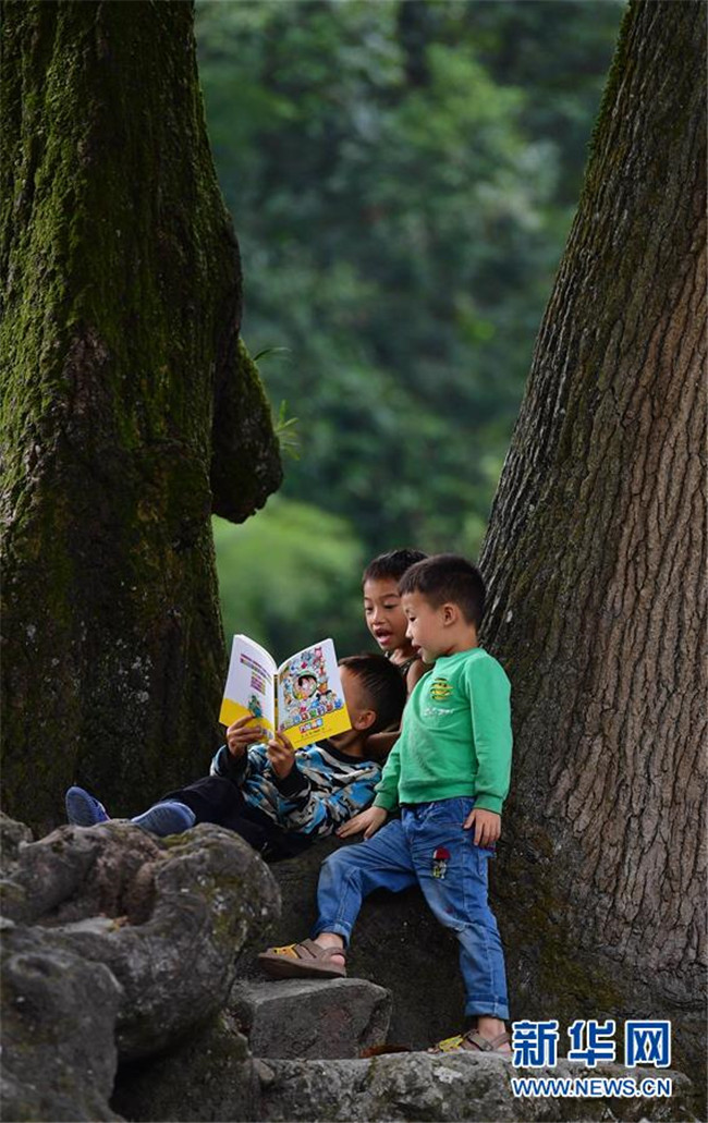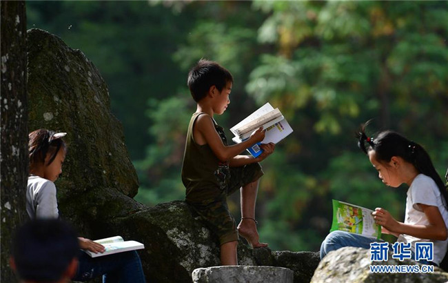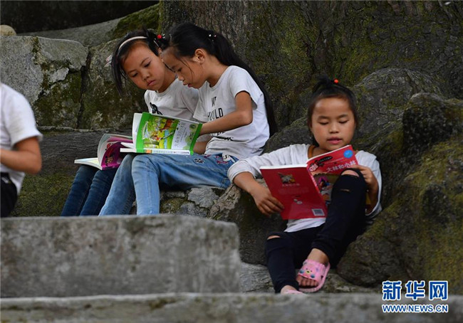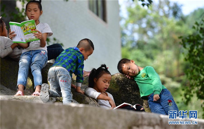 黔桂烏英苗寨的孩子們在閱讀剛剛獲贈的圖書(10月11日攝)。新華社記者 黃孝邦 攝