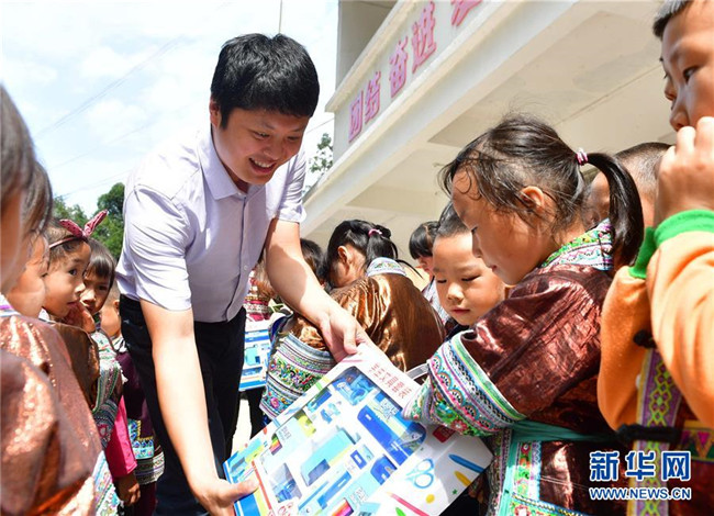 志愿者給黔桂烏英苗寨的孩子們發(fā)放文具(10月11日攝)。新華社記者 黃孝邦 攝