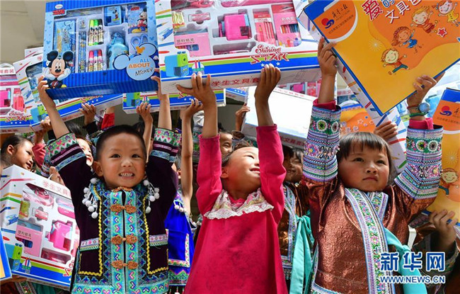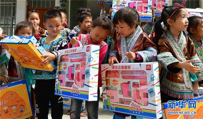 黔桂烏英苗寨的孩子們收到志愿者贈送的文具(10月11日攝)。新華社記者 黃孝邦 攝