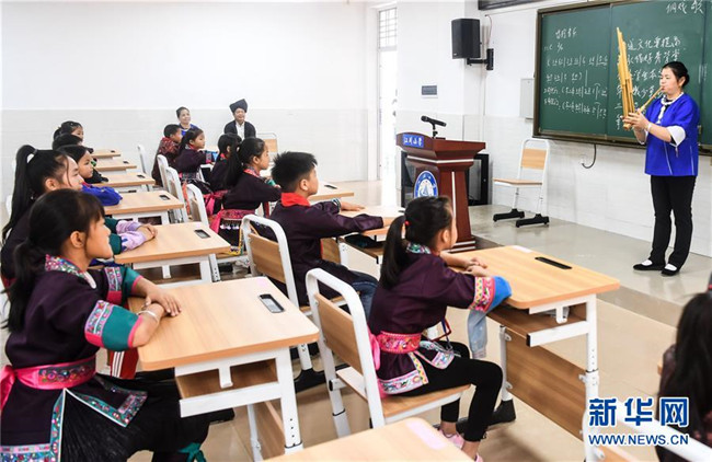 這是廣西三江侗族自治縣民間藝人在教江川小學學生吹奏蘆笙(10月14日攝)。新華社記者張愛林攝