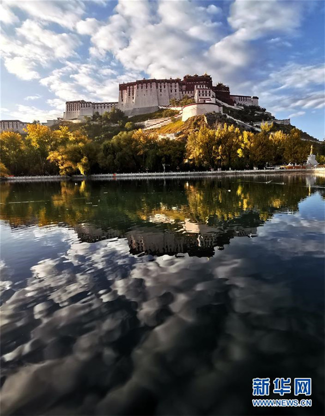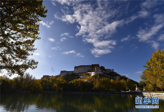 10月16日拍攝的布達(dá)拉宮。 金秋時節(jié),拉薩布達(dá)拉宮在藍(lán)天白云和綠樹碧水的映襯下格外美麗,讓人流連忘返。 新華社記者 覺果 攝