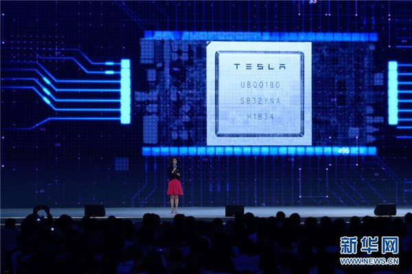 10月20日,特斯拉公司代表在介紹“特斯拉完全自動駕駛芯片”。 新華社記者 黃宗治 攝