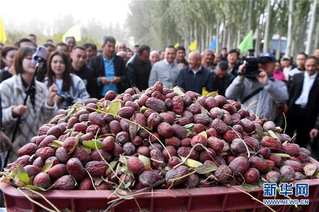 當(dāng)日,新疆且末縣英吾斯塘鄉(xiāng)阿瓦提村有機(jī)紅棗園開展紅棗采摘及直播代言活動,通過在棗園舉行打棗儀式、客人現(xiàn)場采摘等活動慶豐收。 新華社記者沙達(dá)提攝