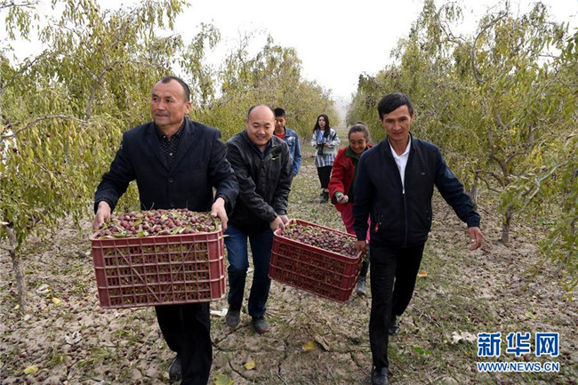 10月19日,在新疆且末縣英吾斯塘鄉(xiāng)阿瓦提村有機(jī)紅棗園,村民在搬運(yùn)紅棗。