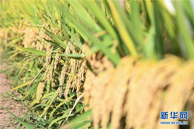 這是第三代雜交水稻新組合試驗(yàn)示范衡南基地測(cè)產(chǎn)現(xiàn)場(chǎng)待收割的水稻(10月21日攝)。 新華社記者 陳澤國 攝
