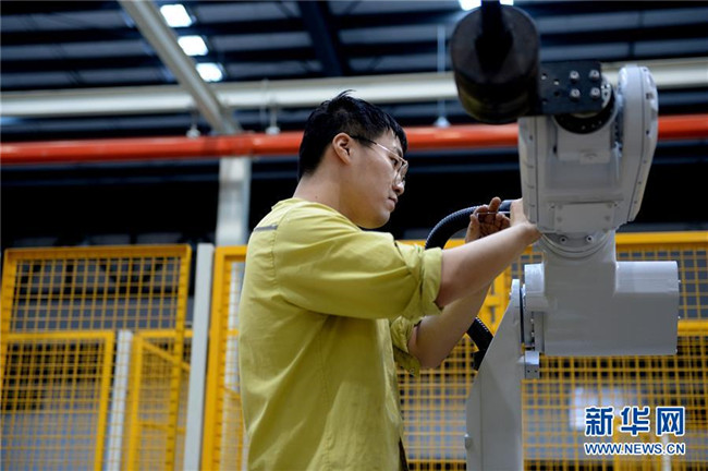 在蕪湖機器人產(chǎn)業(yè)園,工作人員在預裝埃夫特六關節(jié)機器人零部件(10月21日攝)。  新華社發(fā)(黃博涵攝)