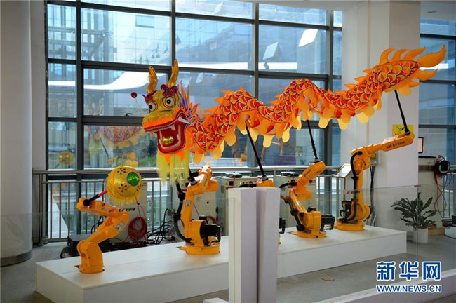 這是10月21日在蕪湖機器人產(chǎn)業(yè)園拍攝的舞龍機器人。  新華社發(fā)(黃博涵攝)