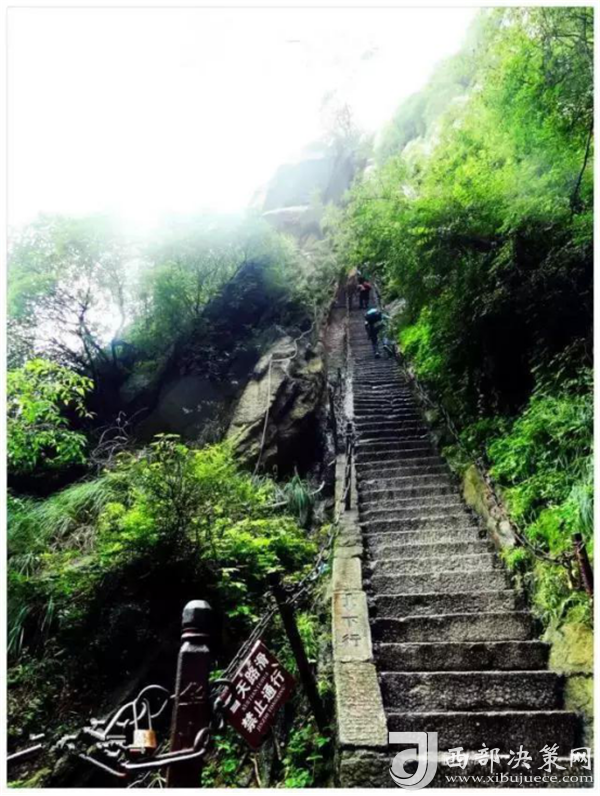千尺幢往上看為一線天,往下望如深井,它形如裂隙,四壁直立,鑿石為梯,被稱為“太華咽喉”,共有370個(gè)臺(tái)階,坡度為70度,是華山著名險(xiǎn)道之一。